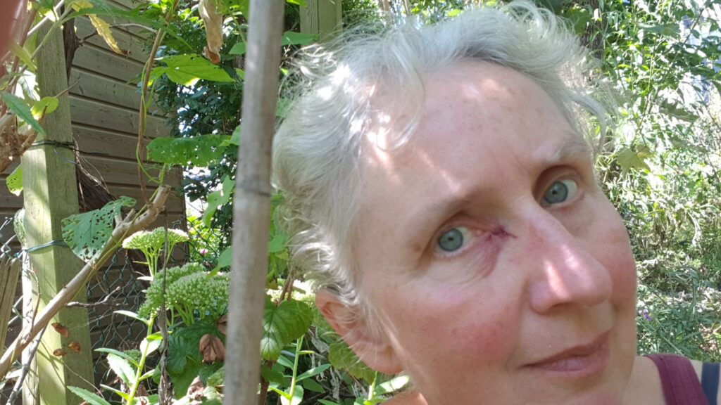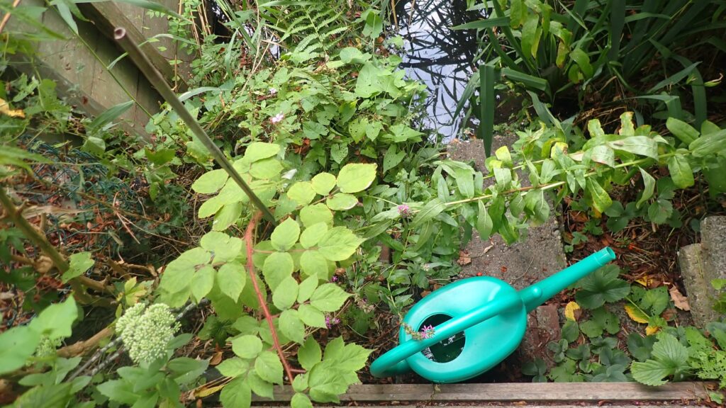 Ik ging water halen bij het slootje achterin de tuin. Het ging mis toen ik bukte. Die bamboestok, links op de foto, voelde ik nèt naast m’n oog prikken. Niet gezien. Bezig met de gieter en het afstapje, met spinnenwebben en overhangende planten.