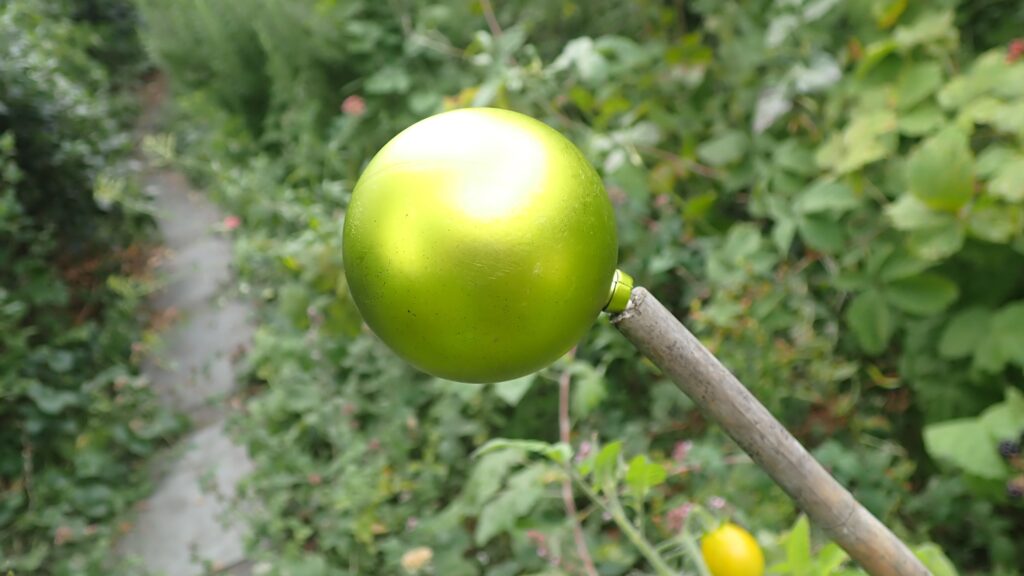 Ouwe plastic kerstbal. Met een satéprikker op de stok.