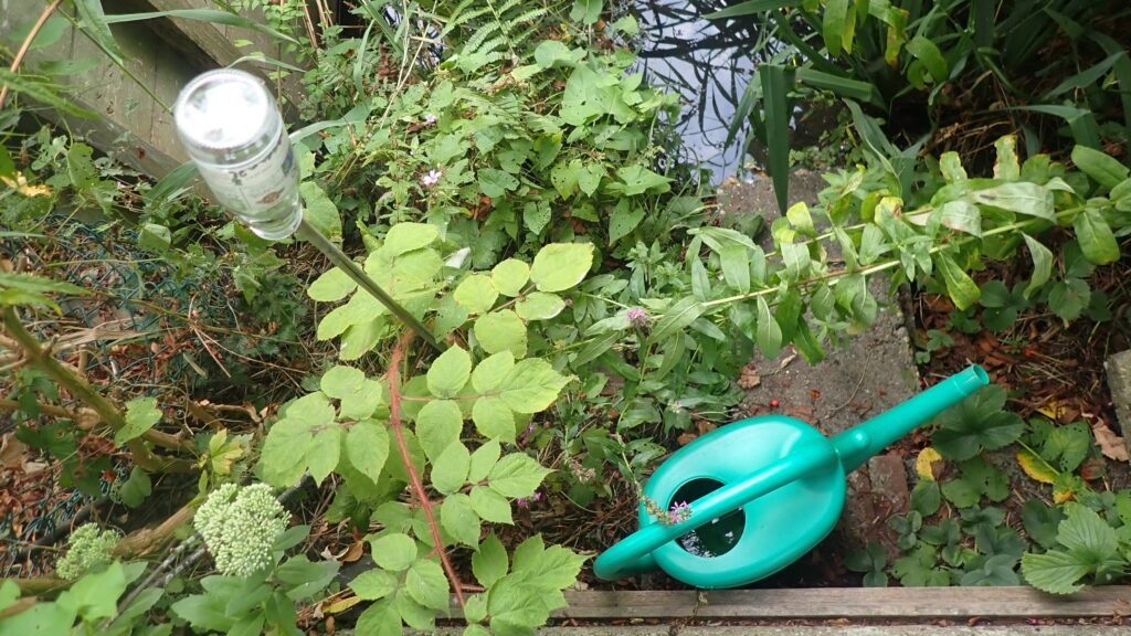 Beetje (veel) snoeien kan geen kwaad :-). Op de kant en in het riet. Voor een emmer is het te ondiep. Op zich gaat het prima met de gieter.